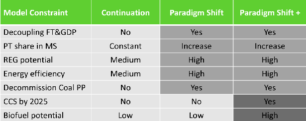 Table with important differences between the three scenarios developed for Germany. FT is freight transport, PT is public transport, MS is modal split of transport , REG is renewable energy generation, PP is power plants, CCS is Carbon Capture and Storage