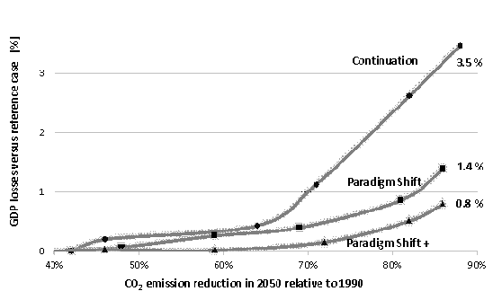 Moving to the ’Paradigm Shift’ scenario, where the carbon lock-in is resolved, while energy efficiency and renewable energy growth rates increase, the cumulative GDP losses are reduced to 1.4%. As an example, in this scenario the personal, motorised transport is reduced from 13,000 p-km today to 11,000 p-km by 2050, and additionally it is assumed that the gap is filled by non-motorized transport, e.g. bicycling or walking.