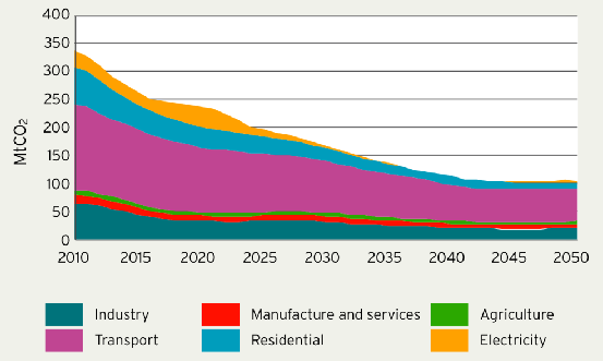 2) Transport sector, where stakeholders agreed to a series of measures including eco-taxes, urban planning, promotion of tele-working, a rail investment program, together leading to a smaller shift from road to rail, but a large-scale introduction of hybrid-electric vehicles. Hybrid-electric vehicles represent 50% of the car fleet in 2040 with most of the rest being fuel-driven cars with consumption better than 3L/100 km.
